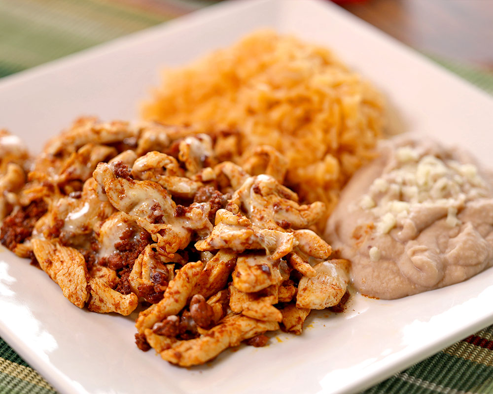 Two quesadillas, one marinated chicken and one beef tips. Drizzled with cheese sauce and served with Spanish rice. CHORI-POLLO 18.99 Grilled chicken strips with Mexican sausage (Chorizo) topped with cheese sauce. Served with spanish rice, refried beans and flour tortillas.